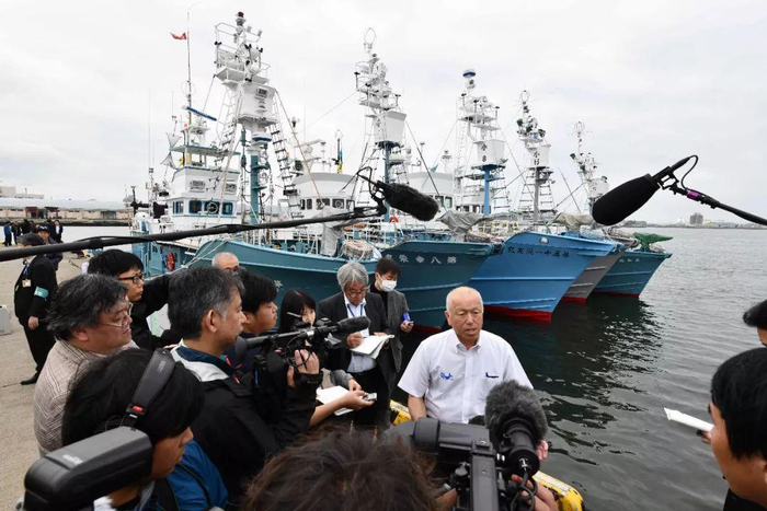 7月1日,在日本北海道钏路一港口,日本一捕鲸协会的负责人在出海仪式前接受媒体采访。新华社/法新