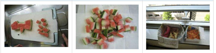横滨市资源循环局的官网上介绍了沥干食物水分的方法。例如,吃剩的西瓜皮需要切成拇指大小的小块,铺在纸巾上或者放入纸质垃圾盒中,拿到通风处晾干。再例如,准备一张废弃CD和一块纱布,用纱布包裹食物,将四周卷起,拧成条穿过CD中间的圆孔,用力挤压CD,排出多余水分。所有含水分的厨余垃圾都需要沥干。
