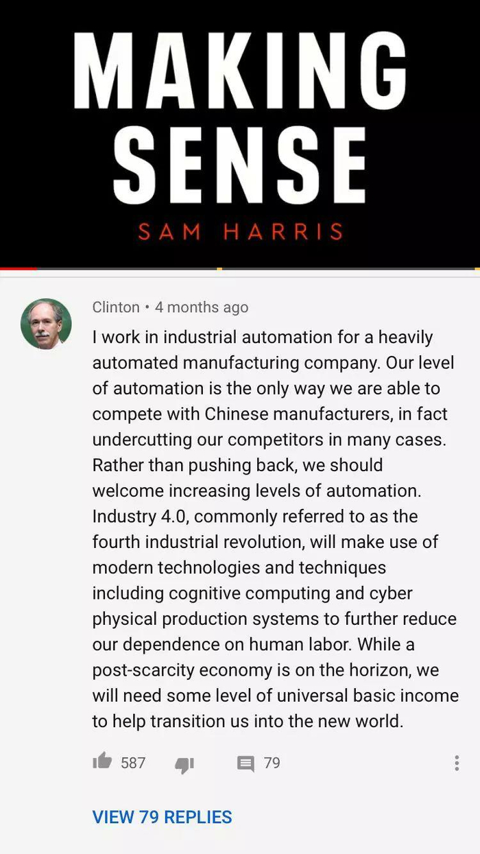 “我从事制造业,我们公司正在广泛地展开机器取代人工的研发。这是我们能与中国竞争的出路,美国也应该拥抱第四次工业革命而不是畏惧它。我非常同意杨安泽的主张,在这个进程中我们需要某种程度的“自由红利”政策去协调科技突破和社会与人的关系。”YouTube