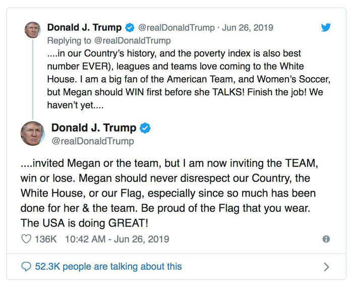 特朗普总统与Megan Rapinoe斗嘴的推文,在说无论输赢都会邀请球队去白宫的同时,对Rapinoe百般指责,说她不应该不尊重国家、白宫、国旗等。