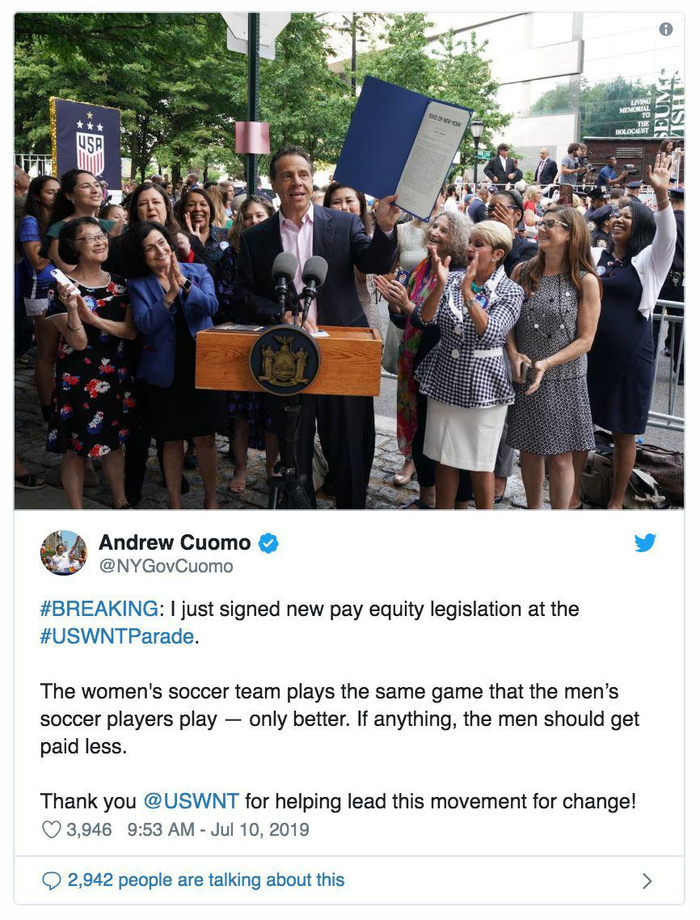 纽约州州长Andrew Cuomo今天在游行庆祝现场签署了纽约州一个新的薪酬公平立法。