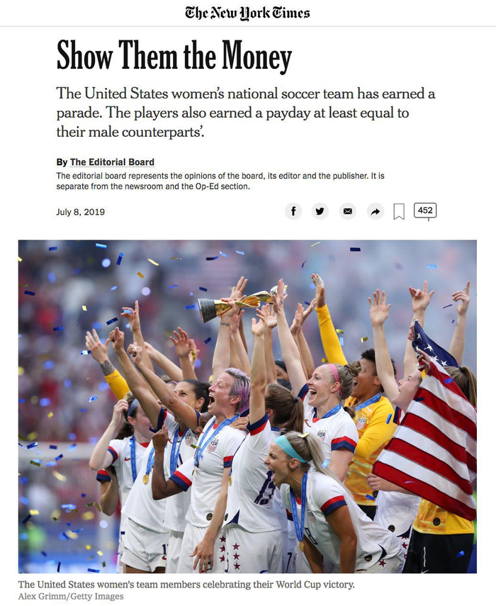 《纽约时报》今天针对女足队员所遭遇的报酬歧视发表社论文章,标题是“把钱给她们”。(《纽约时报》截屏)