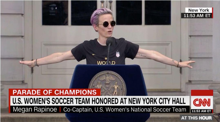 游行之后,Megan Rapinoe在市府大楼前讲话。(CNN截屏)