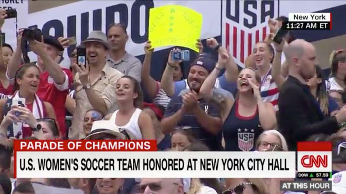 当足联主席也在市府大楼前讲话,强调美国在女足上的投资超过任何别的国家时,广场上的观众一起高呼“同工同酬”。(CNN截屏)