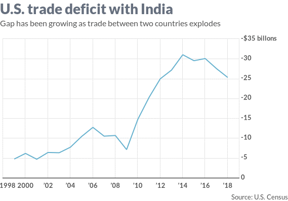 特朗普关注的是贸易赤字差距。去年,美国与印度的贸易逆差为253亿美元,而十年前仅为71亿美元。