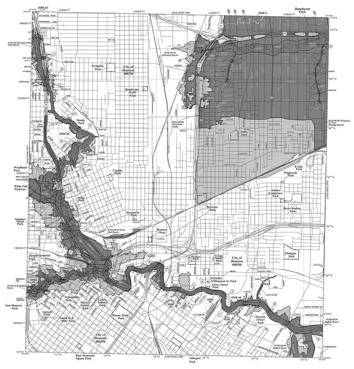 ●休斯顿的洪水地图,深色为洪水高发区 / FEMA