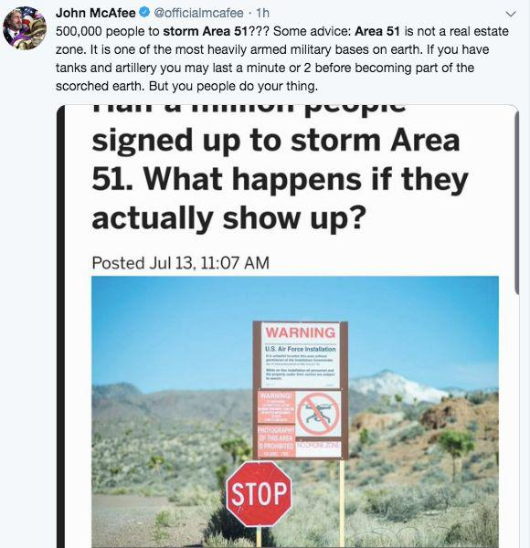 美国空军发言人麦克安德鲁斯(Daura McAndrews)对《华盛顿邮报》说,官方已经看到脸书上的这一活动消息。当被问及如果真有大批人闯入51区,空军方面如何应对,麦克安德鲁斯表示当下无法详细阐述51区的安保措施,但是想对那些试图冒险的人发出警告。