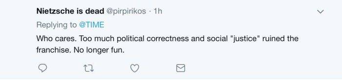 不过,也有很多网友表示这是“007系列”的“终结”。有网友称,“这是至今为止最奇怪的选择。——这与她是个女性或是她的种族无关。这部电影已经被毁了”。还有网友指责,“太多的政治正确和所谓的社会公正毁了这部佳作。一点也不好玩儿了”,“不会再买票去看这部电影”。