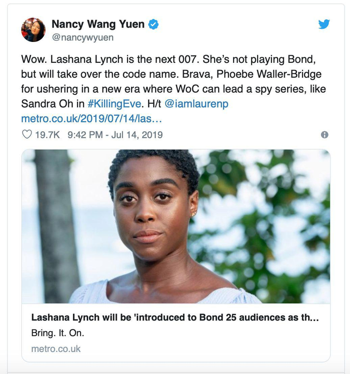 所以,对于007将由一位黑人女性扮演,你怎么看?