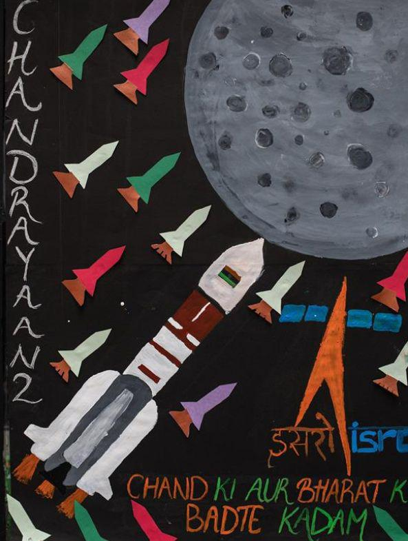 印度学生绘制的拼贴画,描绘“月船二号”探月任务,底部写着:印度迈向月球《纽约时报》截图