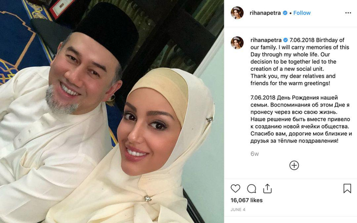 沃沃迪娜(现用名Rihana Oksana Petra)今年7月10日在Instagram上发帖,介绍了她与穆罕默德五世去年6月结婚,今年5月诞下一子等过程。她在帖子中称她的儿子Ismail Leon是“吉兰丹王储殿下”、“马来西亚未来的国王”。