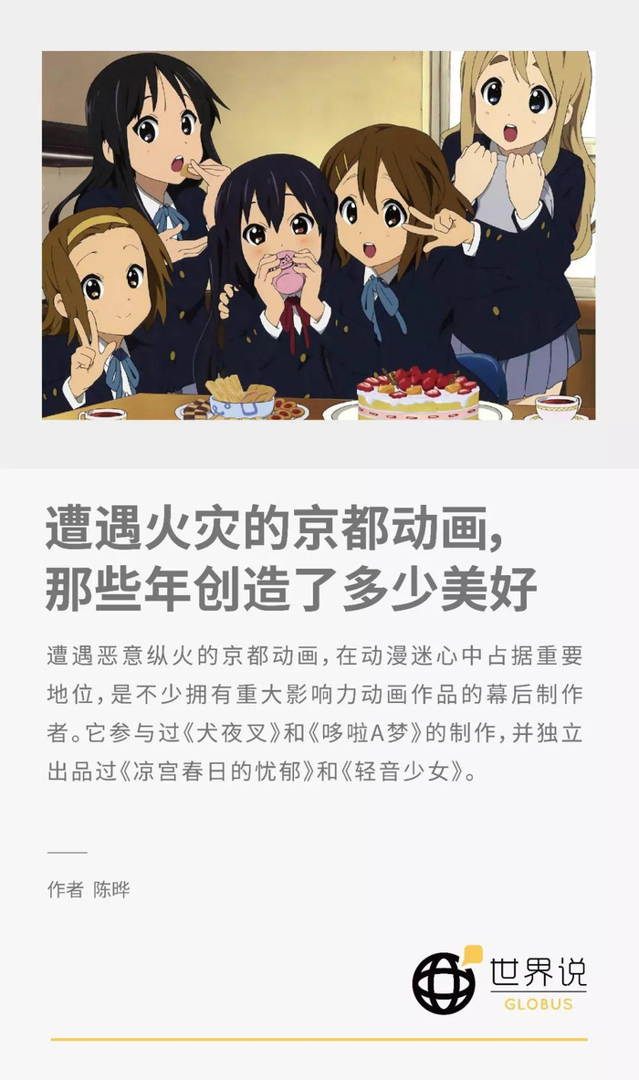 遭遇惨祸的京都动画,是不少知名动画的幕后制作者,它参与过《犬夜叉》和《哆啦A梦》的制作,并独立出品过《凉宫春日的忧郁》和《轻音少女》。