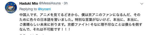 ‘我是中国人。从开始看动漫的时候就是京都动漫的粉丝,因此学了好多日语。也没什么特别的话,就真的希望未来一切都好起来。京都加油!如此不讲理的事是不会打倒我们的 / Twitter 世界说译’