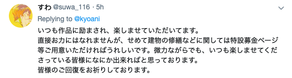 ‘一直以来很喜欢他们的作品也深受鼓舞。虽然无法直接帮上什么忙,但至少关于建筑的修复等,希望能开设募捐网站。尽管微不足道,但还是想为大家做点什么。希望各位尽快恢复 / Twitter 世界说译’