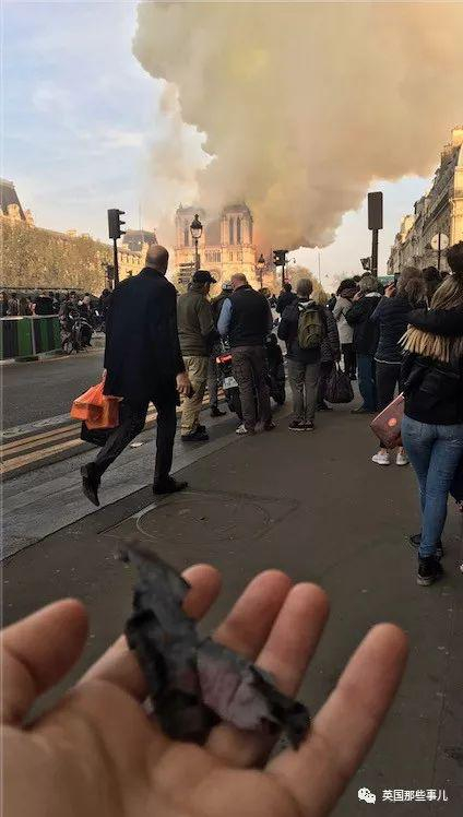 7点29分,此时,已经有烧焦的木质灰烬飘到游客手中。。。。