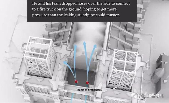 消防队员们抵达现场时的现场状况是极其危险的,因为前面犯下的一连串错误,队员们冲进教堂大厅,爬了300级台阶冲上着火点——教堂主厅上方的木阁楼时,发现火势已经到了消防队员也无能为力的地步,他们根本没法再靠近木阁楼一步了,无奈之下,他们只得被迫撤退…。