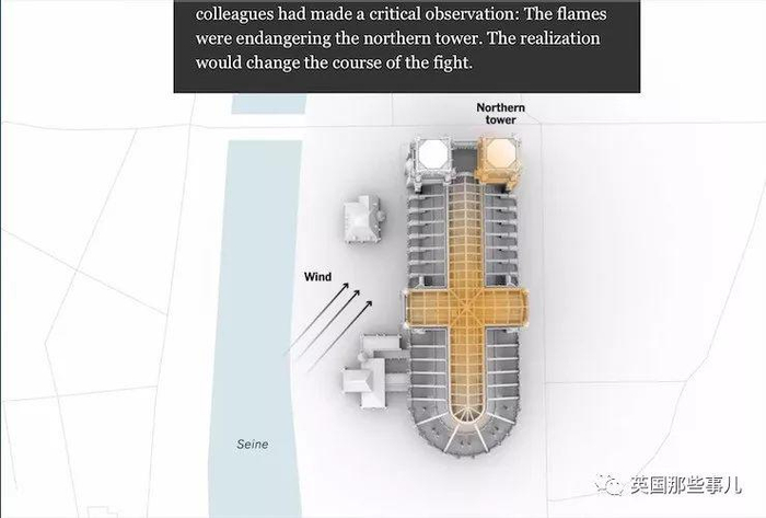 一股强风正从圣母院的南边吹过来,让火焰扑向北边,直接威胁圣母院北塔…。