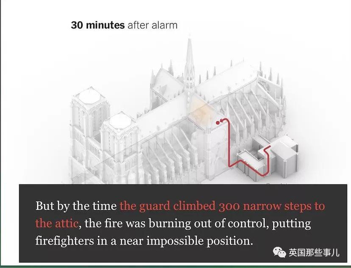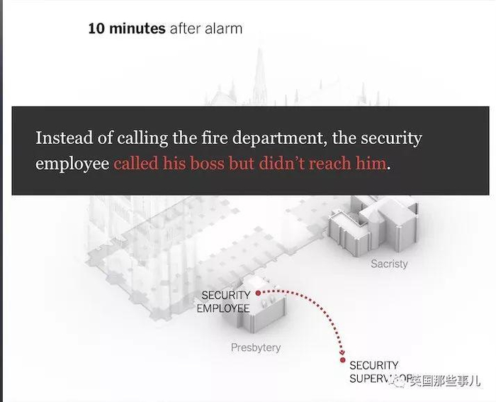 那位刚入职三天的火警安保人员,终于拨打了火警报警电话,此时的圣母院主厅上面的木制结构阁楼,就这样在圣母院的火警安保人员“通知查看——走错地方——通知上司——确定火源”的低效沟通和频繁的错误下,圣母院木阁楼失火后烧了整整30分钟,才终于打了火警电话,让消防队出动来救火……