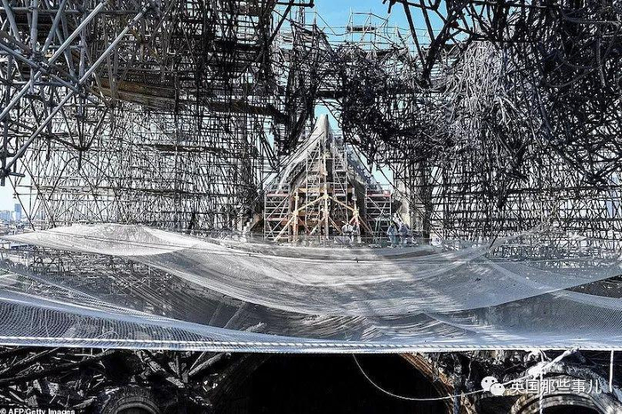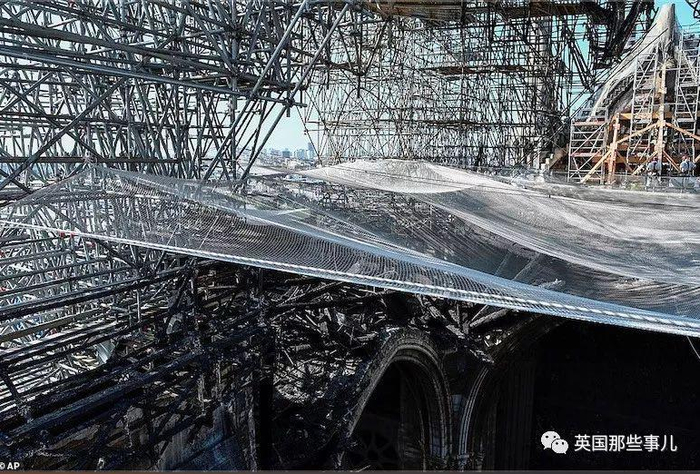 在已经被烧毁倒塌的,昔日塔尖的位置,拉起了一张张防护网,防止屋顶残体继续掉落造成危险,现场小心翼翼进行着的,是火灾之后废墟的清理。