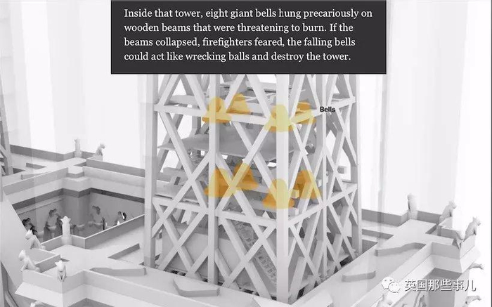 原来,北塔里面悬挂了8个巨大的金属钟,它们一直被挂在木质支架上,如果木支架着了火,