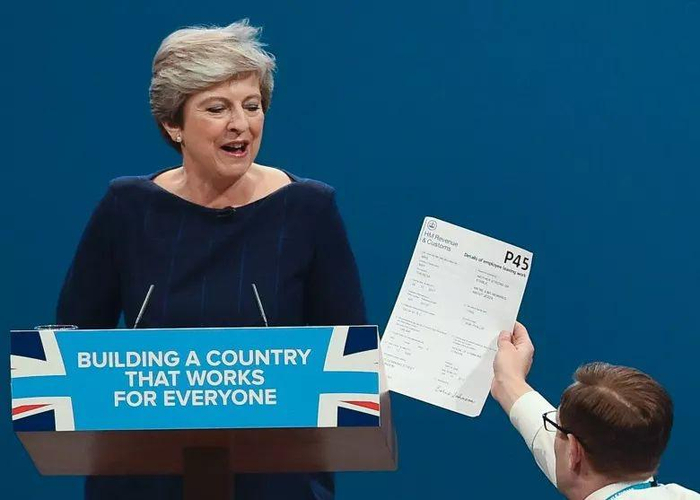 在一次保守党年度大会上,梅因嗓子不适多次中断演讲。就在梅演讲过程中,一名突然闯入的议员将一份名为P45的辞职申请递给了台上的梅,并大声说道:“鲍里斯·约翰逊让我给你。”