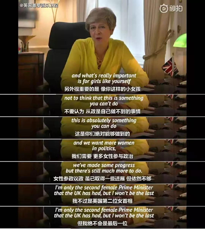 “另外很重要的是,像你这样的小女孩,不要认为,从政是自己做不到的事情,这是你们绝对能够做到的。我们需要更多女性参与政治,女性参政虽然已经取得一些进展,但依然不够。我不过是英国第二位女首相,但我绝不会是最后一位。”