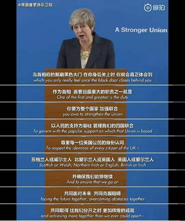 “当首相府的那扇黑色大门在你身后关上时,你就会真正体会到,作为首相,首要且最重大的职责之一就是,你要让整个国家加强联合,以人民的支持为基础管理我们的四国联合,尊重每一位英国公民的身份认同,苏格兰人或威尔士人,北爱尔兰人或英格兰人,英国人或爱尔兰人。并确保我们能够继续,共同面对未来,共同克服阻碍,共同取得比我们分开之时,更加辉煌的成就。”