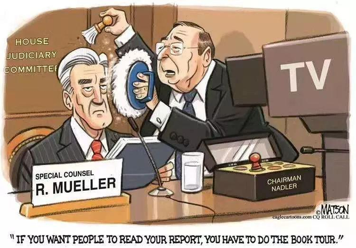 漫画中,众议院司法委员会主席杰罗德·纳德勒(民主党)正在给穆勒打理妆容,嘴里念叨:“如果你想让人们读你的报告,你必须给它来一场巡展”/CQ Roll Call