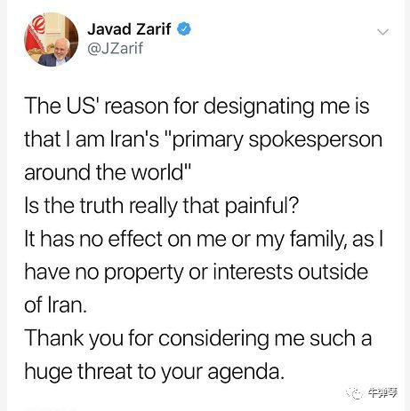 美国制裁我的原因居然是:我是伊朗“在全世界的主要发言人”。真相真的那么难堪吗?这对我和家人没啥影响,因为我在伊朗之外没有财产或利益,感谢你们把我视为对你方议程如此巨大的威胁。