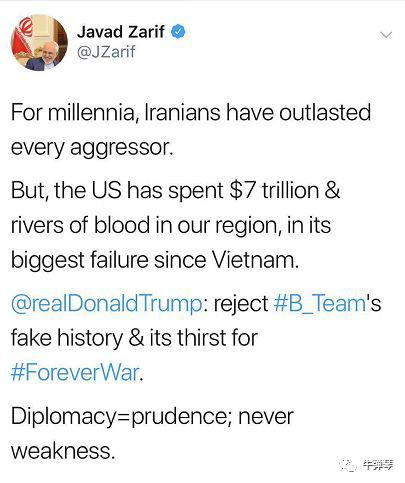 几千年来,伊朗已经超越了所有侵略者。但是,美国在我们这个地区,已经花费了7万亿美元,并且血流成河,这是美国自越南战争后的最大失败。特朗普啊,拒绝B团队的错误历史和对战争的渴望吧。外交=审慎;没有弱点。