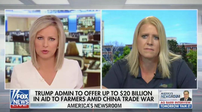 帕蒂·埃德尔伯格(Patty Edelburg),是一位来自威斯康星州的奶农。同时,她也是一个代表20万美国农民的组织、全国农民联盟(NFU)的副主席。今年五月底,当特朗普政府宣布160亿针对农民的救助计划后,福克斯新闻的《America‘s Newsroom》曾采访她,希望她对这笔补贴发表看法。