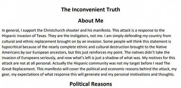 上周六,21岁的克鲁修斯(Patrick Crusius)在得克萨斯州的沃尔玛超市发动枪击前不到一小时,曾在8Chan上发布了四页长的个人宣言。克鲁修斯在宣言中明确支持新西兰清真寺枪击案枪手,称自己发动袭击是为了回应“拉美裔对得州的入侵”。