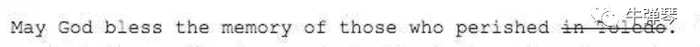 按照惯例,最后,白宫都要公布总统演讲的全文实录。这个出错的地方怎么办?看了一下,发布的全文实录中,“在托莱多”(in Toledo)这两个英文单词,被特意划掉了:愿上帝保佑那些在托莱多死去的人。