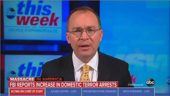 代理白宫办公厅主任米克·穆尔瓦尼在美国广播公司的“本周”节目中为特朗普辩护。民主党指控称,特朗普过去的一些言论淡化了美国白人民族主义情绪上升的威胁,这些分裂言论正在助长类似埃尔帕索市的白人民族主义仇恨犯罪行为/视频截图