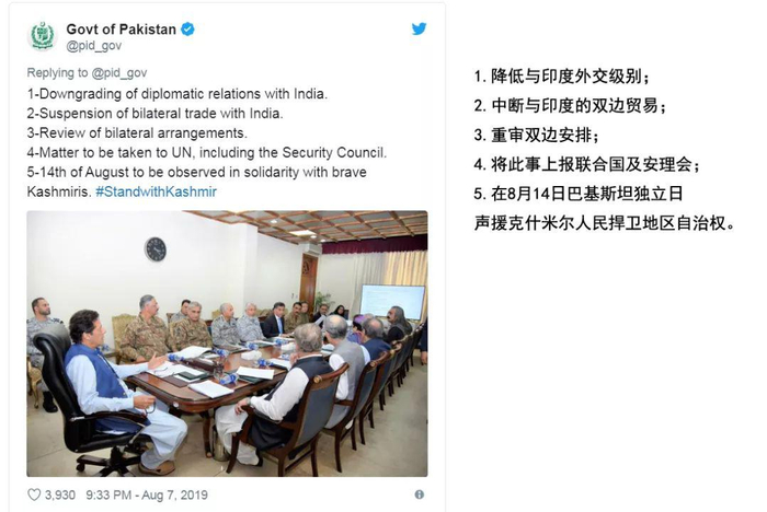 -巴基斯坦总理对此表示了谴责,并于7日发表声明称将降低与印度的外交级别,中断双边贸易。