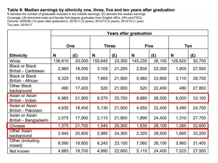 除了在学术方面的表现外,华裔在收入方面也一骑绝尘,领先于其他族裔。据BBC报道,华裔在毕业后一年、三年和五年的收入中位数最高,薪资分别为2万1700英镑、2万5300英镑和2万8100英镑。然而在毕业十年后,华裔的收入(3万2600英镑)被印度裔(3万3100英镑)和其他亚裔(3万3200英镑)反超。