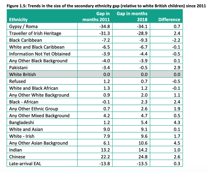 数据显示,虽然华裔学生占全部学生人数0.4%,但华裔学生在数学和英语GCSE方面表现“明显更好”,领先英国白人学生24.8个月。而在这次报告中表现最差的是吉普赛/罗姆学生。他们在中学结束时将比英国白人学生落后三年(34.1个月)。