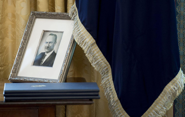 (2017年2月,老弗雷德·特朗普的一张照片被摆在白宫椭圆形办公室的桌子上)