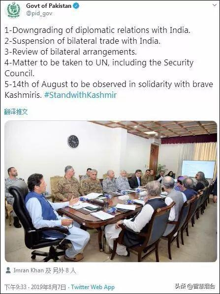 8月7日,巴基斯坦政府宣布,将克什米尔问题提交联合国安理会,同时下调与印度外交关系,并中断双边贸易。
