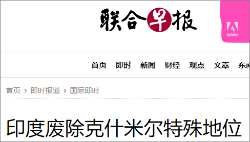 ▲新加坡《联合早报》早前报道,克什米尔邦前首席穆斯林部长曾指出,印度废除克什米尔特殊地位,这“是印度民主最黑暗的一天”。