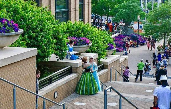 会展中心和宾馆实际上是连着的,中间有一个带阶梯的广场,很多人在那里跳舞。灯火中人来人往,非常热闹。我和儿子坐在宾馆内紧靠门边的一张桌前,同桌还有一对白人夫妇。他们来自邻州马萨诸塞,陪女儿参加动漫节。女孩15、6岁,站在妈妈身边,她爸爸对她说:外面在跳舞,你快出去玩吧。女孩高高兴兴地推开门到广场上去了。