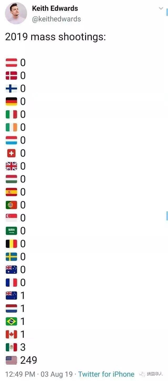 Keith Edwards的推文:2019年世界各国发生大规模枪击案的次数。美国以比第二名国家几乎多百倍的数字占据第一。