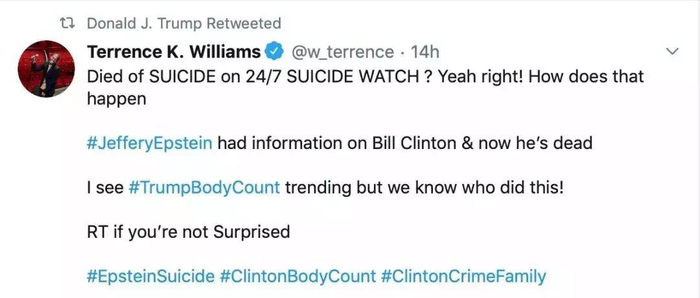 美国《新闻周刊》在报道中将爱泼斯坦称作“特朗普的老友”,英国《独立报》则将爱泼斯坦称作“特朗普的旧友”。但现在特朗普当然是极力撇清关系,德新社7月9日报道,白宫当地时间7月9日称,美国总统特朗普至少10年没有与金融家爱泼斯坦说过话。特朗普还想“甩锅”,8月10日,他转发了一名网友的“阴谋论”推特,该推特暗示称前总统比尔·克林顿、前国务卿希拉里与爱普斯坦的死亡有关。克林顿发言人Angel Urena则回应称这“太可笑了”。