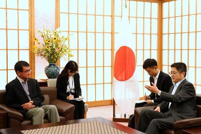 赴日出席中日战略对话的乐玉成与日本外相河野太郎进行会谈(图/新华社)