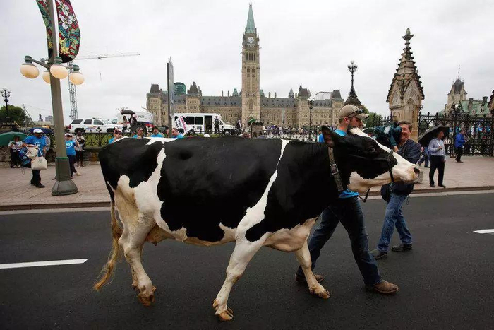 ●2016年,一名加拿大奶农牵着他的奶牛上街,以抗议进口牛奶 / Business Insider