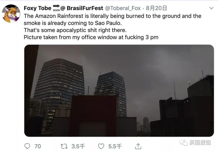 “整个亚马逊丛林真的要被烧没了,烟尘都已经来到了圣保罗。实在太末世了。照片是我下午三点在办公室拍的”