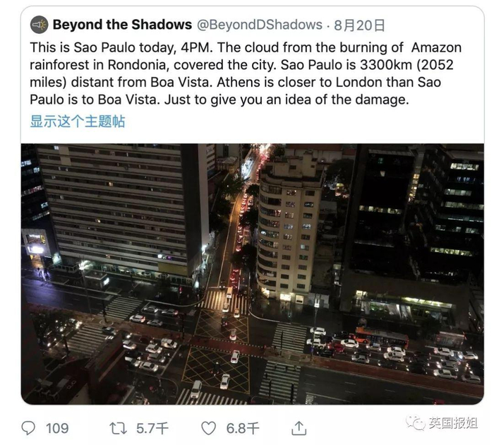 “这是下午四点的圣保罗。亚马逊森林大火的烟尘从Rondonia一直飘到了这里。圣保罗距离那里有3300千米远。给大家一点概念:这个距离比雅典到伦敦都远了。”