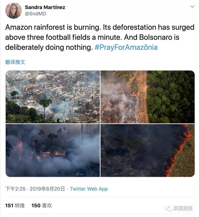 “亚马逊雨林正在燃烧。去森林化在以每分钟三个足球场的速度进行着。然而Bolsonaro(巴西总统)却什么也没做”