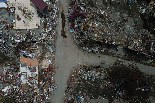 这是2018年10月8日在印度尼西亚中苏拉威西省帕卢航拍的海啸灾区倒塌房屋。新华社发(王申摄)