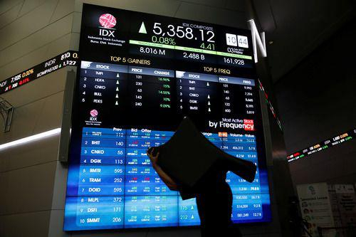 印度尼西亚雅加达,一名工作人员走过一块电子股价显示屏。新华社/路透